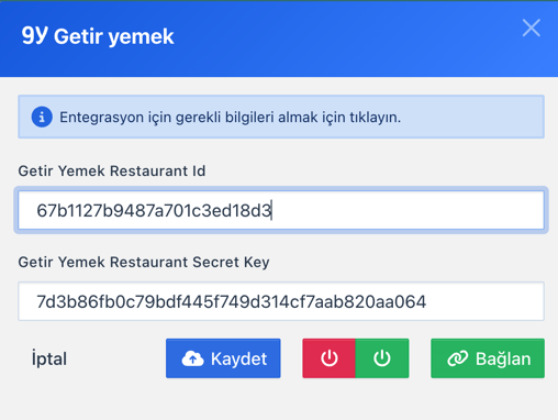 Ardından Ritapos’un ayarlar sayfasında bulunan “Entegrasyonlar” kartından “Getir Yemek” formunu açın ve restoranın secret key’ini forma girin. Ardından;