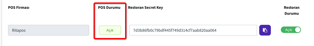 POS entegrasyon kartı içerisinde bulunan “Restoran Secret Key” bilgisini hemen yanında bulunan tuş ile kopyalayın ve “Restoran Durumu”nun açık olduğundan emin olun.