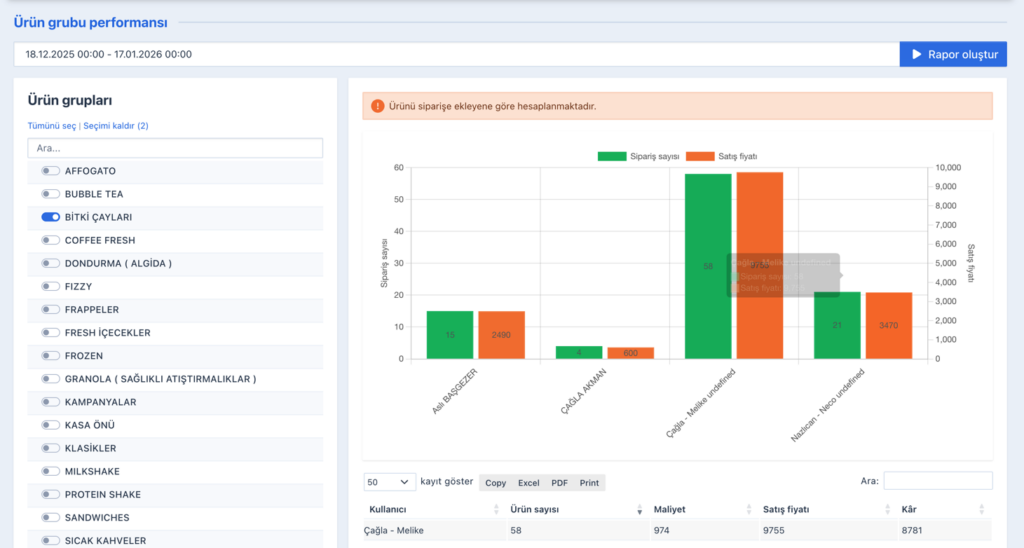 Tarih aralıkları girilip “Rapor Oluştur” tuşuna basıldığında çalışanların performansları hesaplanarak tablo şeklinde raporlanmaktadır.