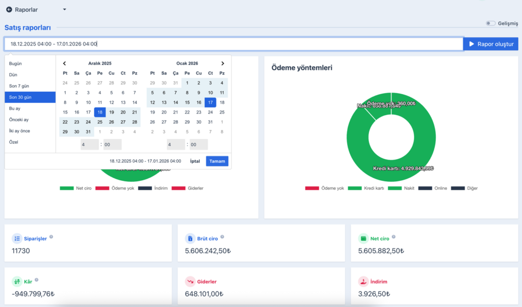 Rapor aşağıdaki gibi gösterilmekte olup, öncelikli olarak sipariş sayısı, ciro ve indirim tutarları verilmektedir. Sayfa içeriğinde ise ödeme tiplerine göre çizilmiş grafik ve altında raporu, sağ tarafta ise seçili tarih aralığında gerçekleşen tüm siparişler listelenmektedir.