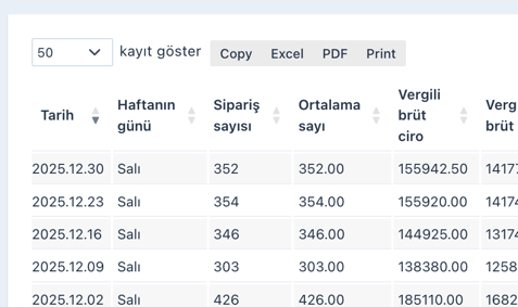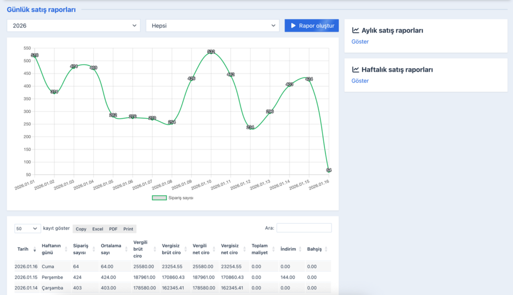 Bir yıl içerisindeki siparişlerinizin günlük dağılımını görebilir. Ara alanına gün belirterek sadece 1 günü filtreleyebilirsiniz.